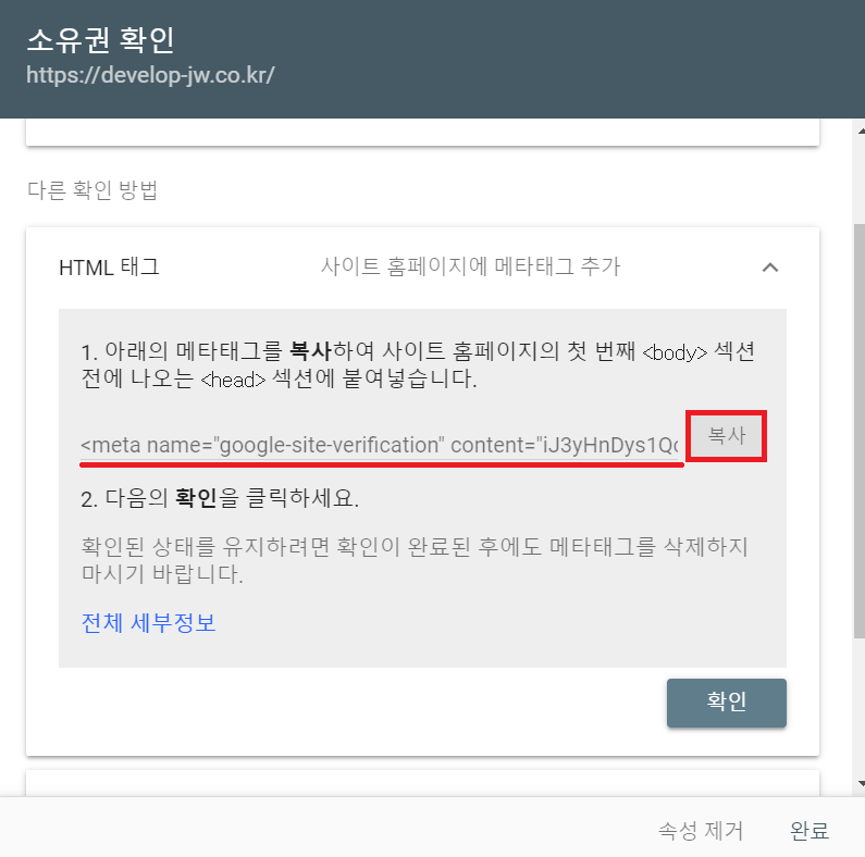 4. 메타태그를 복사해야 한다. 태그옆에 복사 버튼을 누른다.
