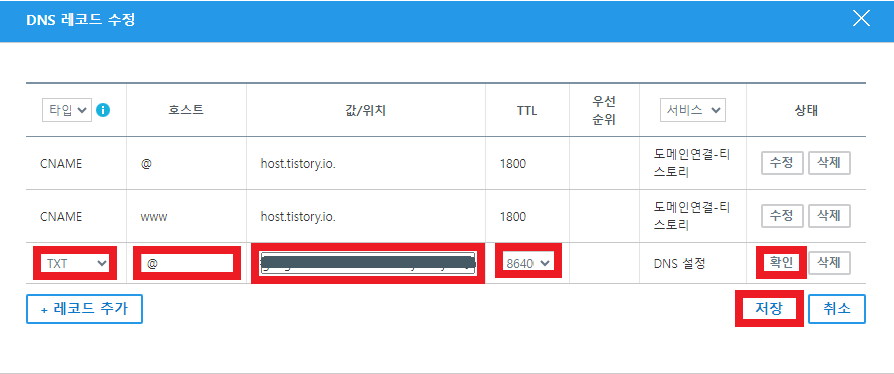 8. 레코드 추가란에 다음과 같이 입력해준 후 확인을 누르고 저장을 누른다.