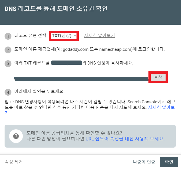 7. 구글 서치콘솔의 소유권 확인 창에서 레코드 유형 TXT를 확인하고