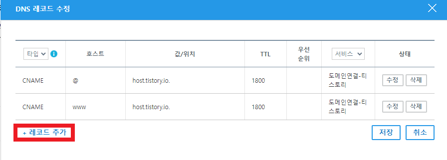 6. DNS 레코드 수정 팝업창에서 레코드 추가를 클릭한다.