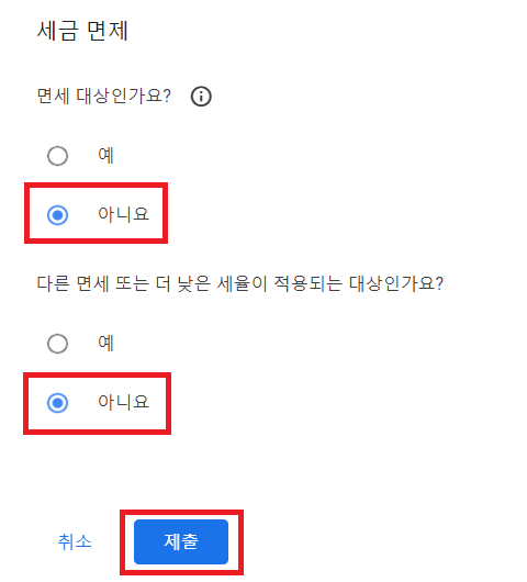 세금 면제도 모두 '아니요'를 클릭후 제출을 클릭한다.