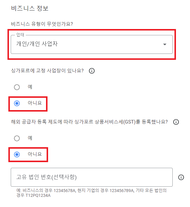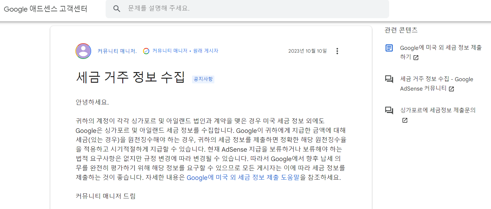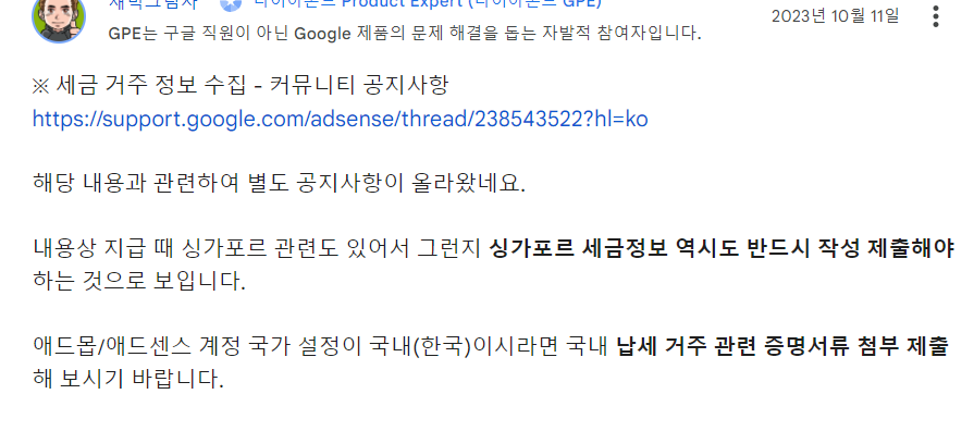 구글 애드센스 싱가포르 세금 정보 입력 방법