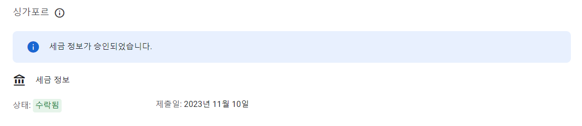 싱가포르의 세금 정보가 승인되었습니다. 라고 뜨며