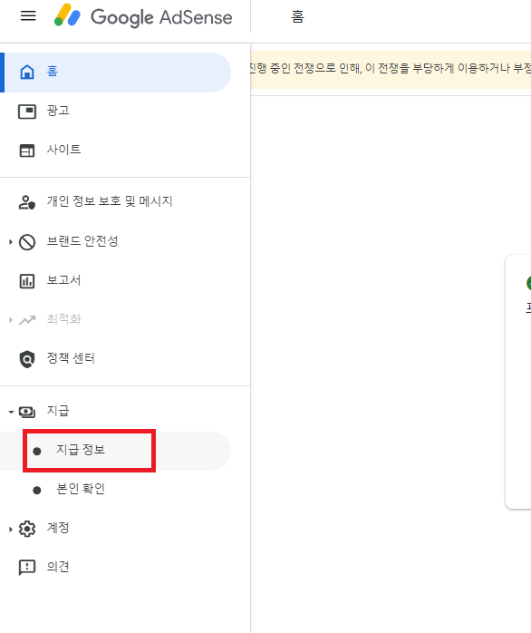 왼쪽 메뉴의 지급 정보 메뉴를 클릭한다.