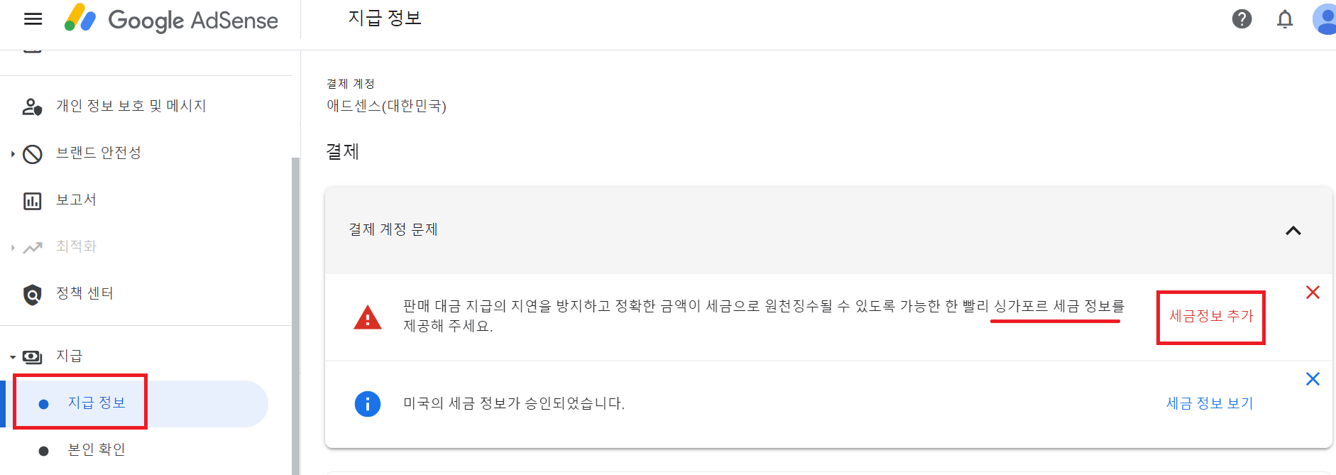 구글 애드센스 싱가포르 세금 정보 입력 방법