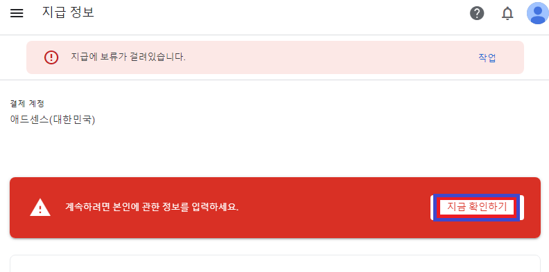 2. 지급 정보 화면에서 아래 빨간색 메시지 박스의 지금 확인하기를 누른다.