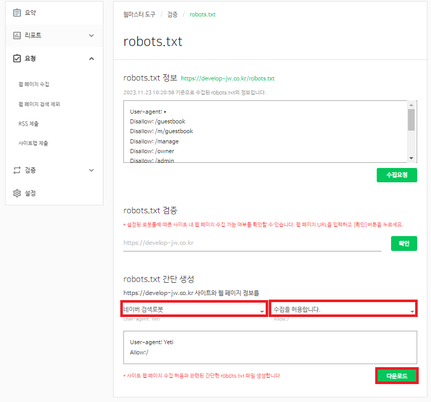 7. robots.txt 간단 생성에서 네이버 검색로봇, 수집을 허용합니다를 클릭한후 다운로드를 누른다.
