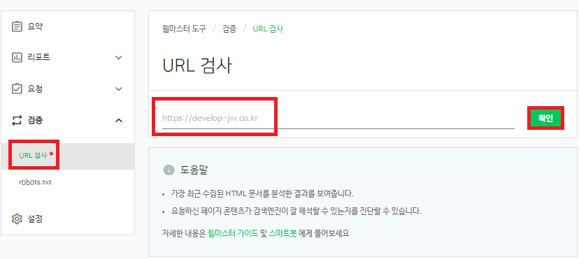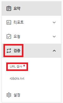 3. 웹마스터 도구 / 요약 페이지의 왼쪽 메뉴에서 검증 → URL검사를 클릭한다.