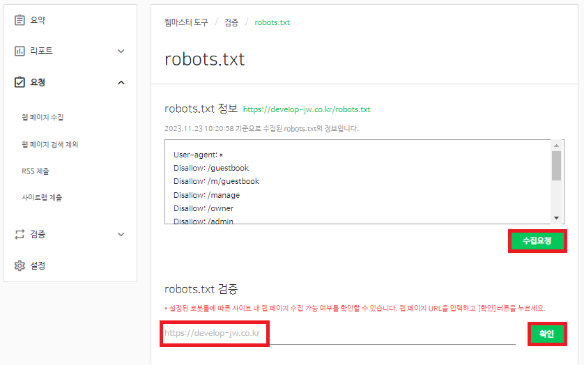 14. 다시 네이버 서치어드바이저 창으로 돌아가 robots.txt정보에서 수집요청을 누르고