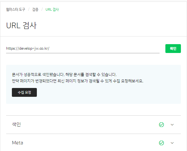 16. 다시 검증 → URL검사를 클릭한 후 자신의 블로그 주소를 입력한 후 확인을 누르면