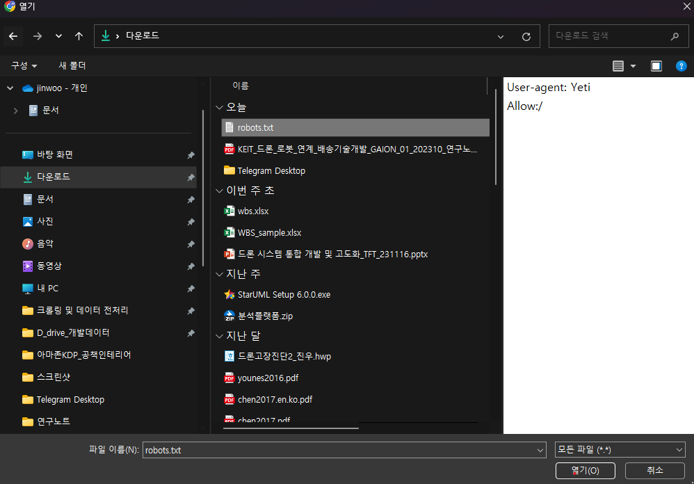 8. 아래와 같이 다운로드 파일에 robots.txt가 다운로드 된 것을 알 수 있다.