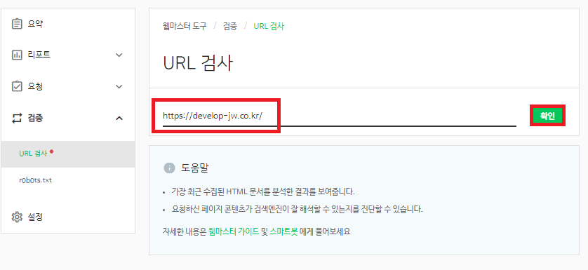 3. 웹마스터 도구 / 요약 페이지의 왼쪽 메뉴에서 검증 → URL검사를 클릭한다.