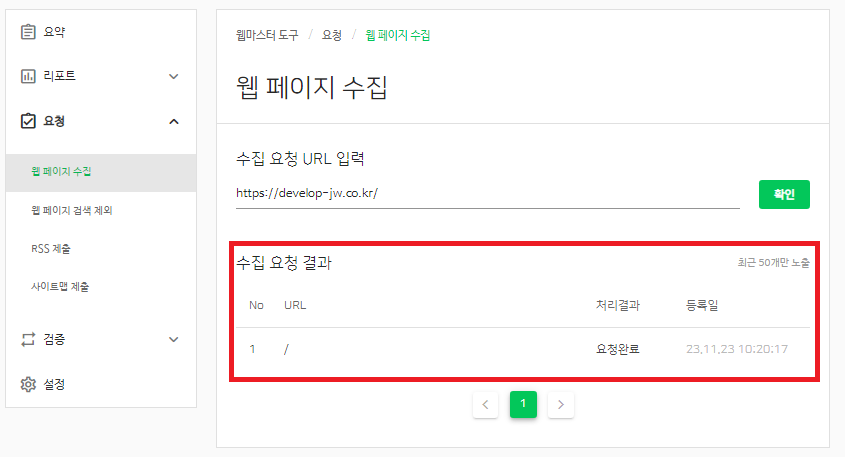 수집 요쳥 결과에 "/"라고 뜨며 요청완료라고 뜬다.