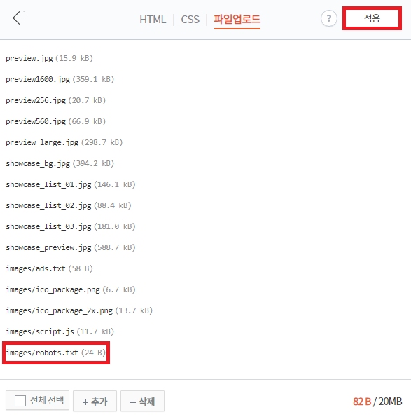 13. robots.txt가 업로드 됐는지 확인하고 적용을 누른다.
