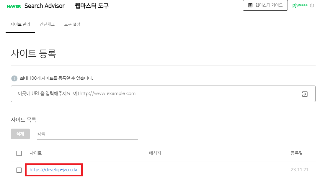 2. 웹 마스터 도구 화면에서 사이트 목록에서 내 블로그 주소를 클릭한다.