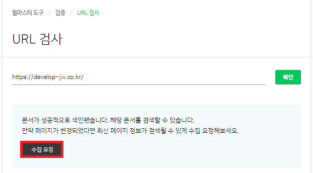 18. 몇 분뒤 수집성공이라고 뜨면서 자신의 블로그가 사이트 수집이 잘됐는지 확인 할 수가 있다.