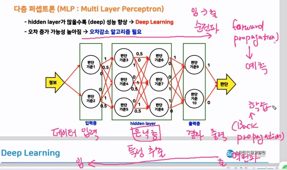 -> 추론된 결과에서 에러를 계산하고 출력층~입력층으로 에러를 전파시키면서 최적의 모델을 만드는 것