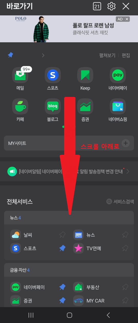 3) 메뉴화면에서 아래로 스크롤을 맨 마지막까지 내린다.