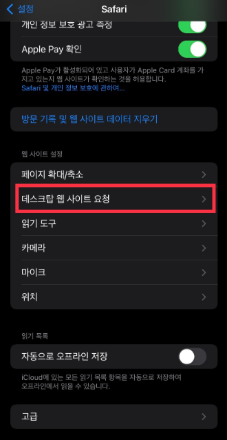웹사이트 설정 부분의 ‘데스크탑 웹사이트 요청’ 선택