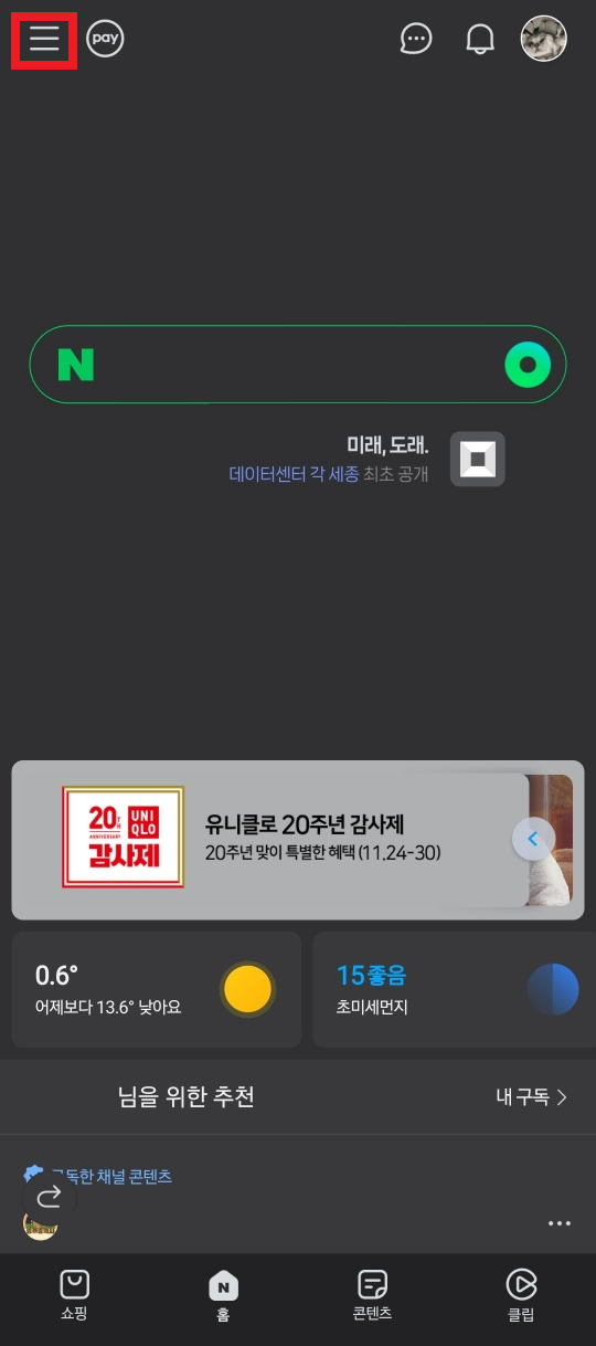 2) 왼쪽 상단의 네비게이션 버튼(짝대기 3개)를 누른다.