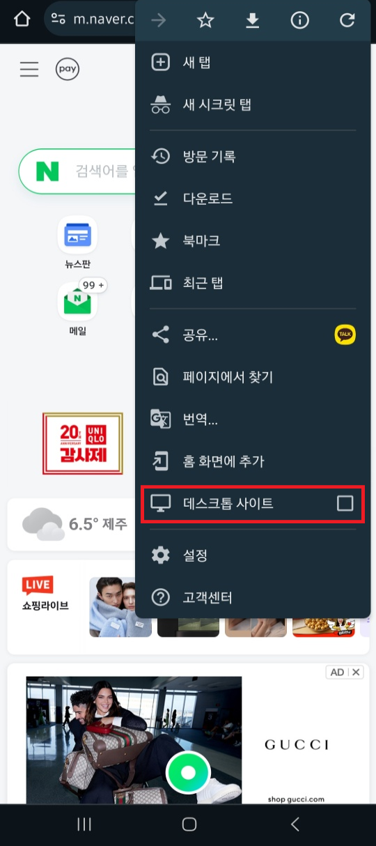 3) 메뉴에서 데스크톱 사이트를 누르면 PC버전으로 바뀐다.