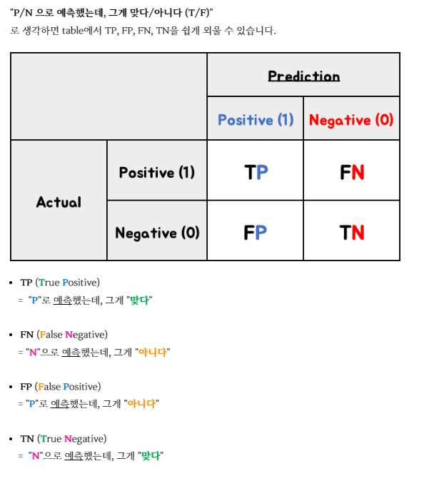 - False(가짜) Negative(음성): 음성으로 예측했고, 그게 틀리다(사실 양성)