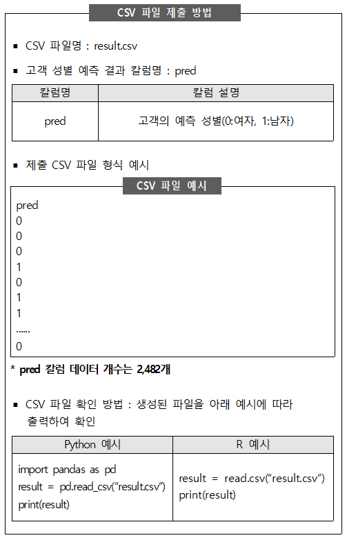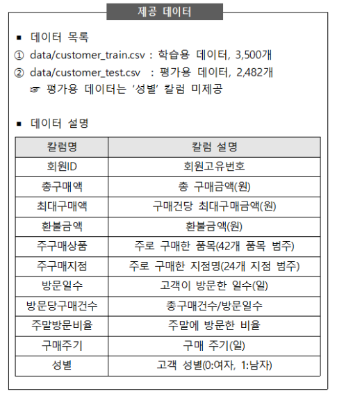 제공된 데이터는 백화점 고객이 1년간 상품을 구매한 속성 데이터이다. 제공된 학습용 데이터(data/customer_train.csv)를 이용하여 백화점 구매 고객의 성별을 예측하는 모델을 개발하고, 개발한 모델에 기반하여 평가용 데이터(data/customer_test.csv)에 적용하여 얻은 성별 예측 결과를 아래 【제출 형식】에 따라 CSV 파일로 생성하여 제출하시오.