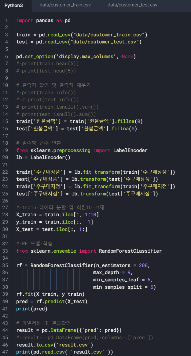 34~39: RandomForest를 이용하여 모델 학습 및 예측