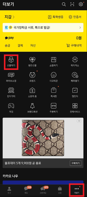 더보기 메뉴를 누르고 선물하기를 누른다.