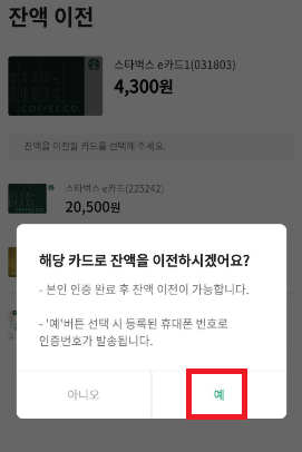 7. 잔액 이전을 누르면 "해당카드로 잔액을 이전하시겠어