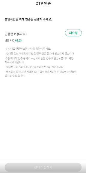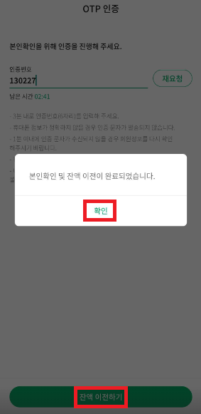 이전하기 버튼을 누르면 "본인확인 및 잔액 이전이