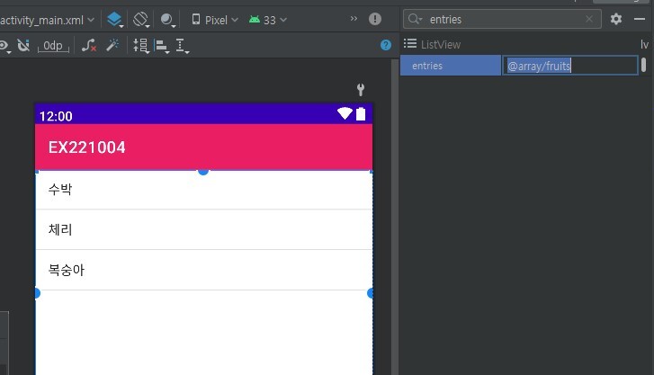 android:entries="@array/fruits"