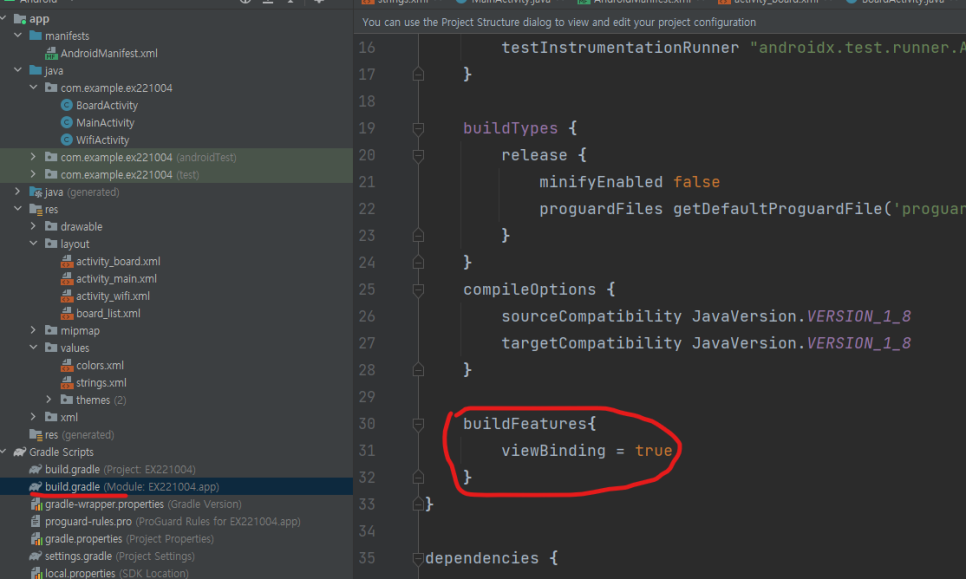 android 하위에 buildFeatures{viewBinding = ture} 추가 후 sync now 클릭