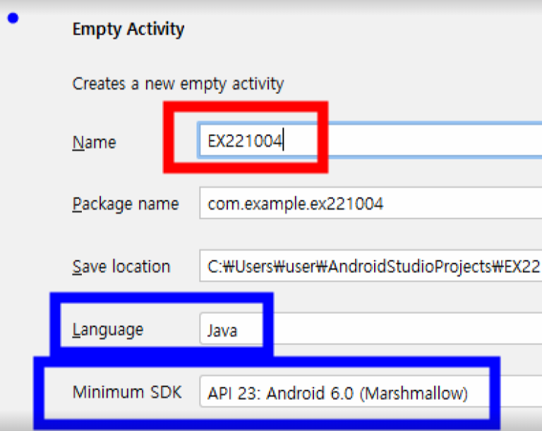 3) Name을 지정해주고 Language와 Minimum SDK를 아래와 같이 확인한다.