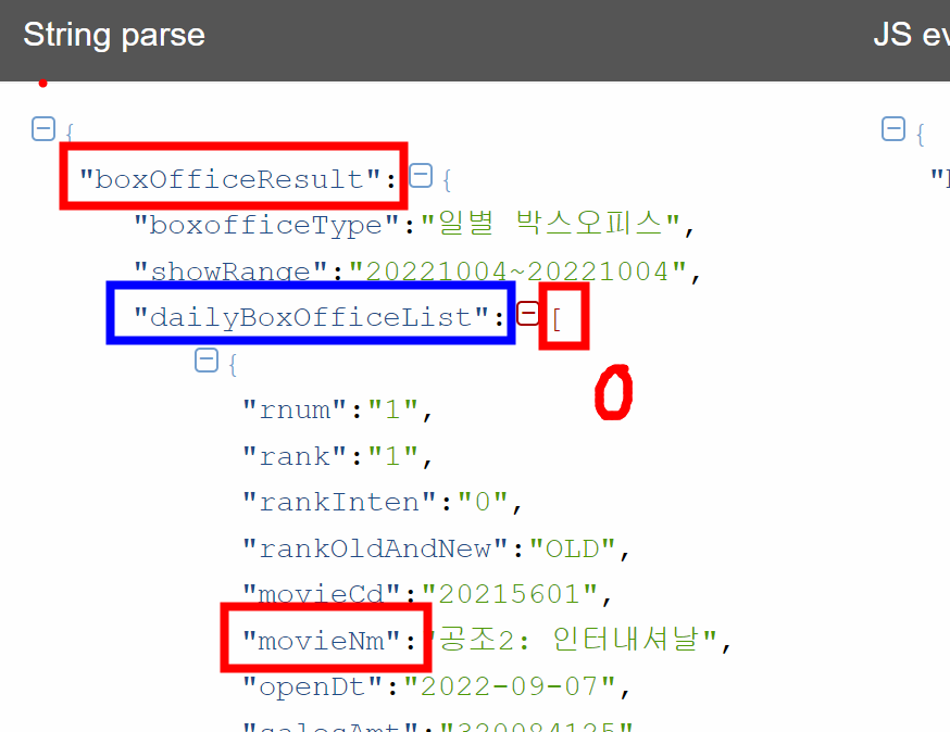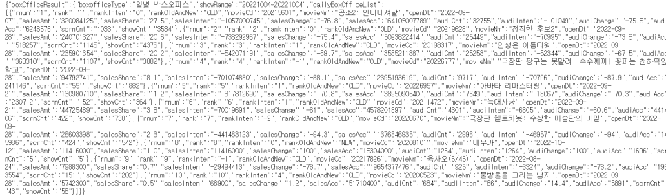 String url2 = "https://kobis.or.kr/kobisopenapi/webservice/rest/boxoffice/searchDailyBoxOfficeList.json?key=f5eef3421c602c6cb7ea224104795888&targetDt=20221004"; # url2에 22.10.04 영화진흥위원회 사이트 저장