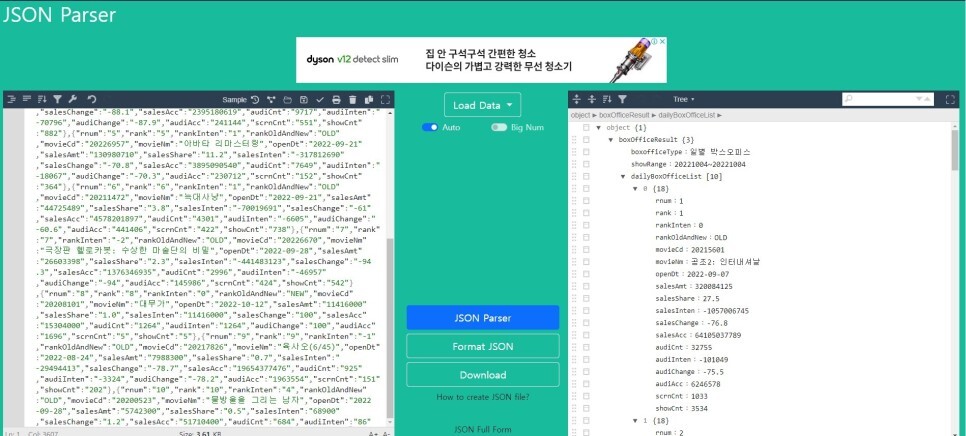 String url2 = "https://kobis.or.kr/kobisopenapi/webservice/rest/boxoffice/searchDailyBoxOfficeList.json?key=f5eef3421c602c6cb7ea224104795888&targetDt=20221004";