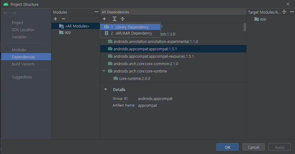- File -> Project Structure -> Dependencies -> '+' 누른 후 -> Library dependency