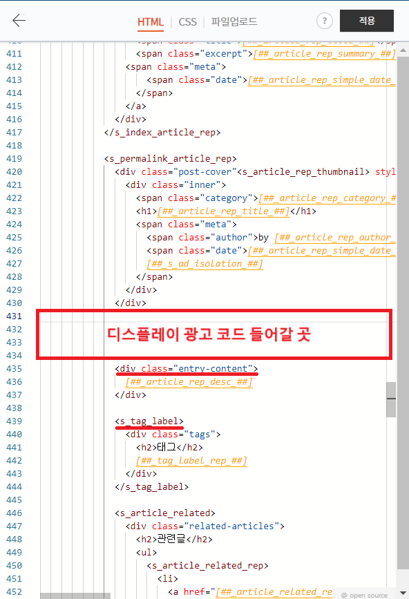 4)  <s_tag_label>의 위쪽에 <divclass="entry-content">를 찾고 위쪽 빈공간에 복사한 디스플레이 광고 코드를 아래와 같이 <div>코드 사이에  "<div> 디스플레이 광고 코드 </div>"형태로 넣어준 다음 적용을 누른다.