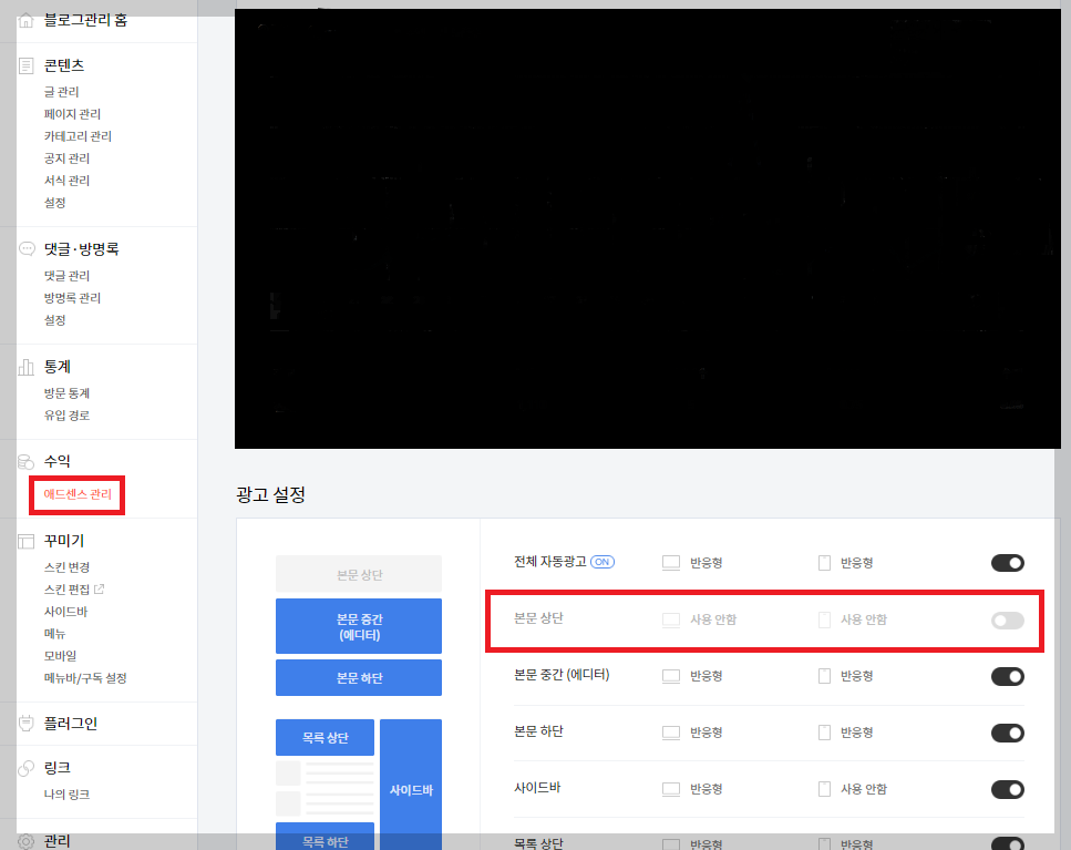 5) 적용을 한후 자신의 블로그 관리창을 다시 들어가서 [ 수익 - 애드센스 관리 ]를 클릭하고 애드센스 관리 화면의 광고 설정에서 본문상단 광고를 사용안함으로 바꿔준다.