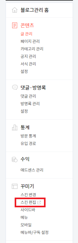 1) 자신의 티스토리 블로그의 관리페이지로 들어간 다음 [꾸미기 - 스킨편집]을 누른다.