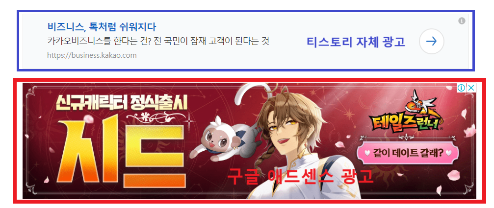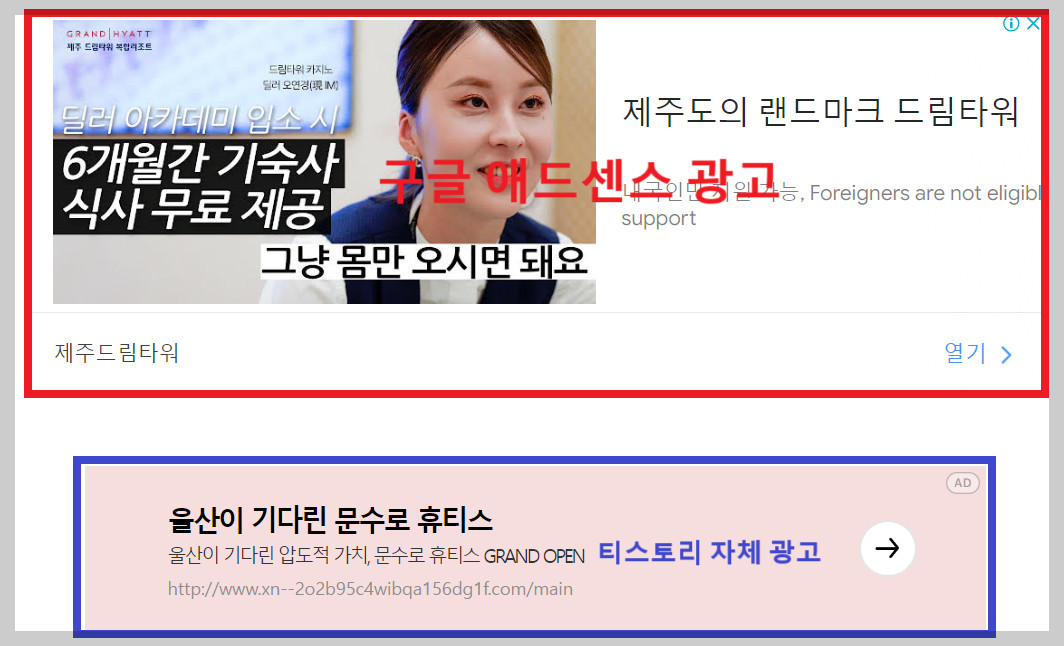 위와 같이 구글 애드센스 자동광고를 넣거나 수동광고를 통해 광고를 삽입하면 위가 티스토리 자체광고 아래가 구글 애드센스 광고가 뜬다. 정책상 티스토리의 자체 광고를 누락할수는 없다.