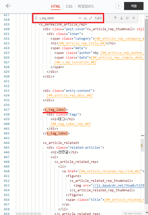 3) html 편집화면에서 [ Ctrl+F ]를 눌러서 s_tag_label 를 입력해준다.