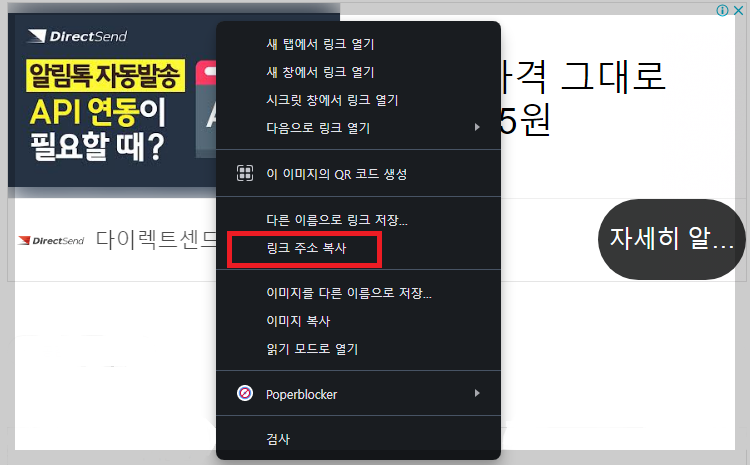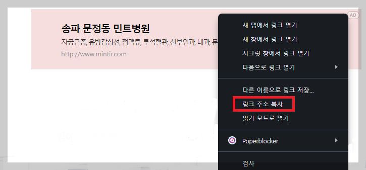 1) 확인하려는 광고를 오른쪽 클릭해서 광고의 링크 주소를 복사한다.