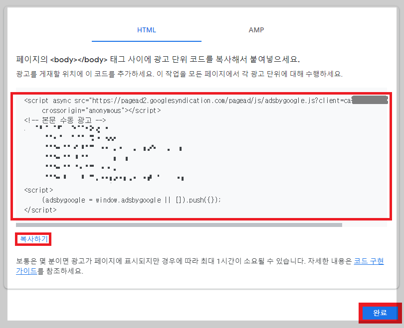 2) 아래의 빨간 박스의 광고코드를 복사하거나 아래의 복사하기를 누른다.
