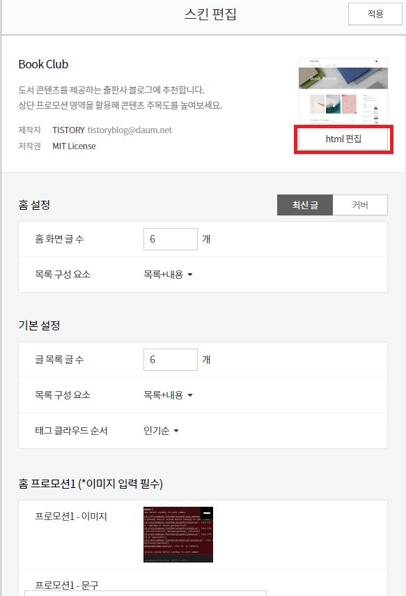 2) 스킨편집 화면에서 오른쪽 상단의 html편집을 누른다.