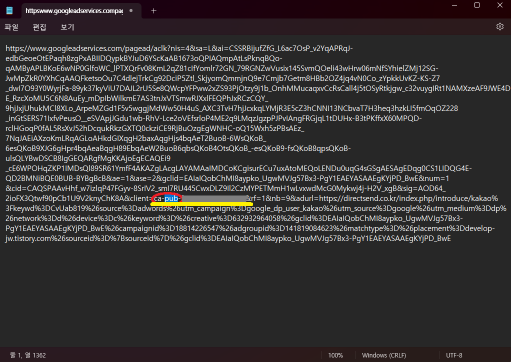 2) 메모장을 열고 주소를 붙여 넣기하면 아래와 같이 주소가 길게 나오는데 "ca-pub-"의 형태를 찾고"ca-pub- [자신의 PUB코드 ]"에서 PUB 코드를 확인하면 된다.