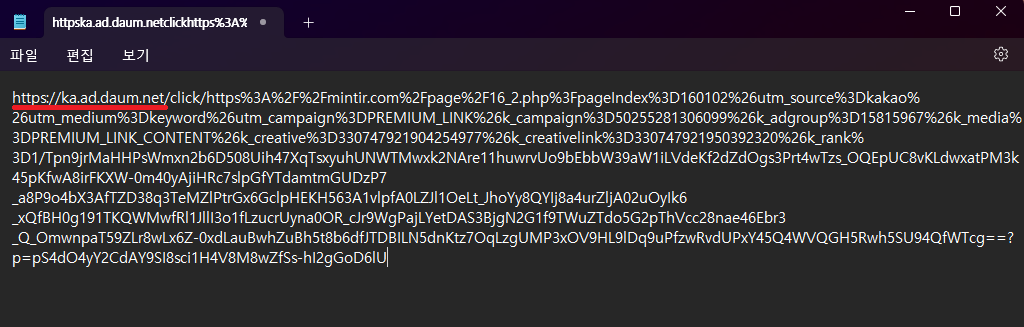 3) 티스토리 자체 광고의 경우 위와 같은 방법으로 링크주소를 복사한 뒤 메모장에 주소를 넣어보면 링크 주소의 앞부분에 https://ka.ad.daum.net/라고 되어 있어서 티스토리의 광고임을 알 수 있다.