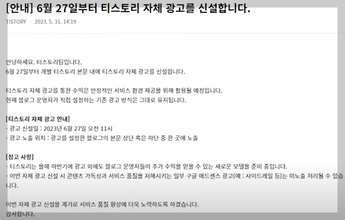 올해 6월부터 티스토리에서 상단과 하단에 자체 광고를 넣으면서 기존의 애드센스를 이용해 수익을 창출하던 블로거들의 수익을 줄어들게 했다.