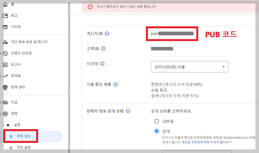 PUB 코드는 구글애드센스의 홈화면의 왼쪽메뉴에서 [ 계정 - 설정 -계정정보 ]를 들어가서 게시자 ID의 PUB 코드를 확인할 수 있다.