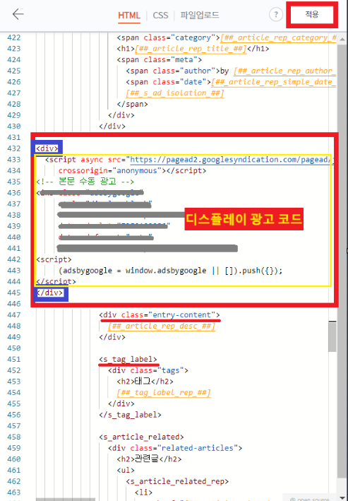 4) <s_tag_label>의 위쪽에 <divclass="entry-content">를 찾고 위쪽 빈공간에 복사한 디스플레이 광고 코드를 아래와 같이 <div>코드 사이에 "<div> 디스플레이 광고 코드 </div>"형태로 넣어준 다음 적용을 누른다.